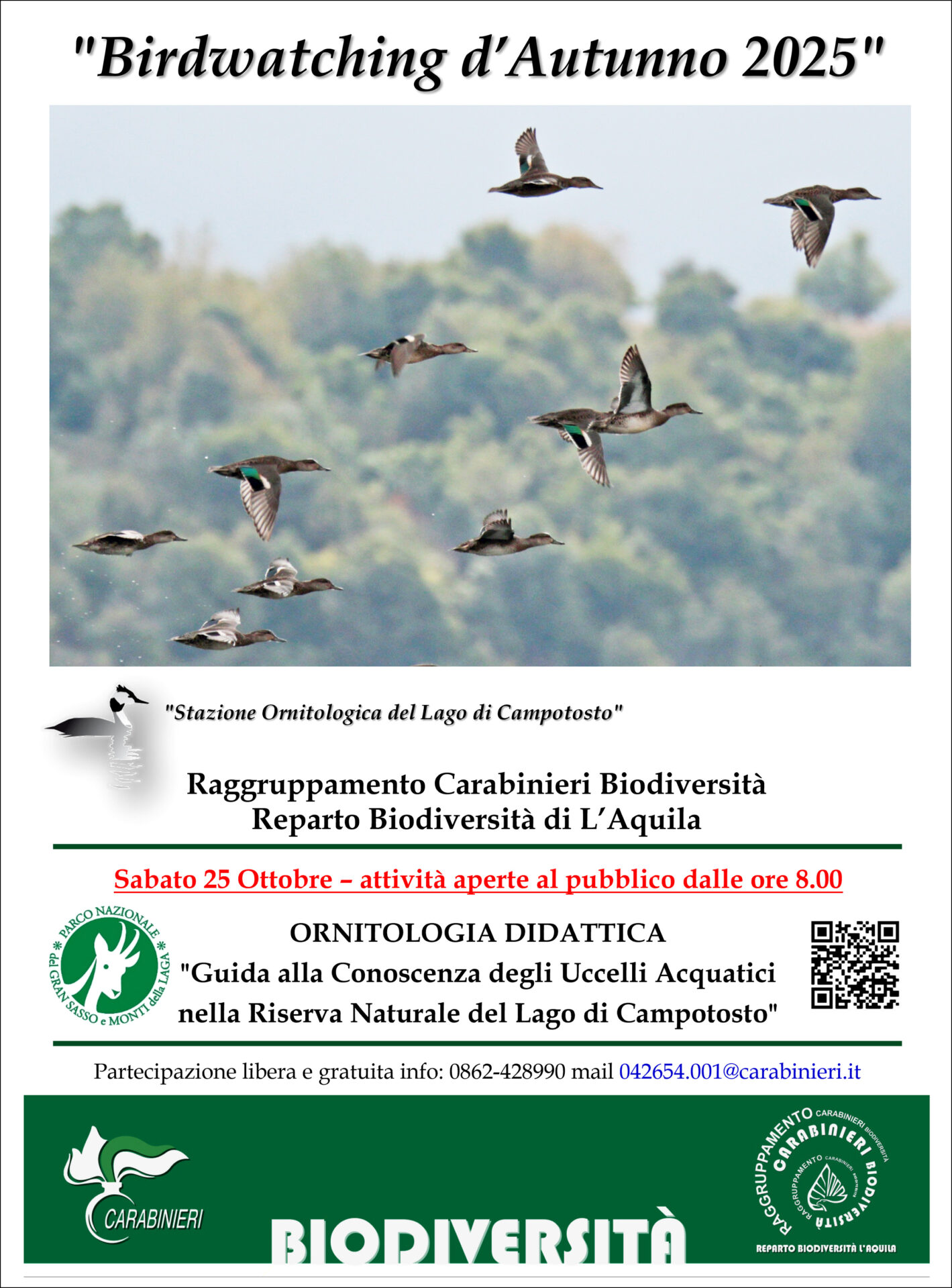 Il Reparto Carabinieri Biodiversità di L’Aquila, promuove una giornata aperta al pubblico, presso la Riserva Naturale di Popolamento Animale Lago di Campotosto, denominata: Ornitologia Didattica 2025 – “Birdwatching d’Autunno”.